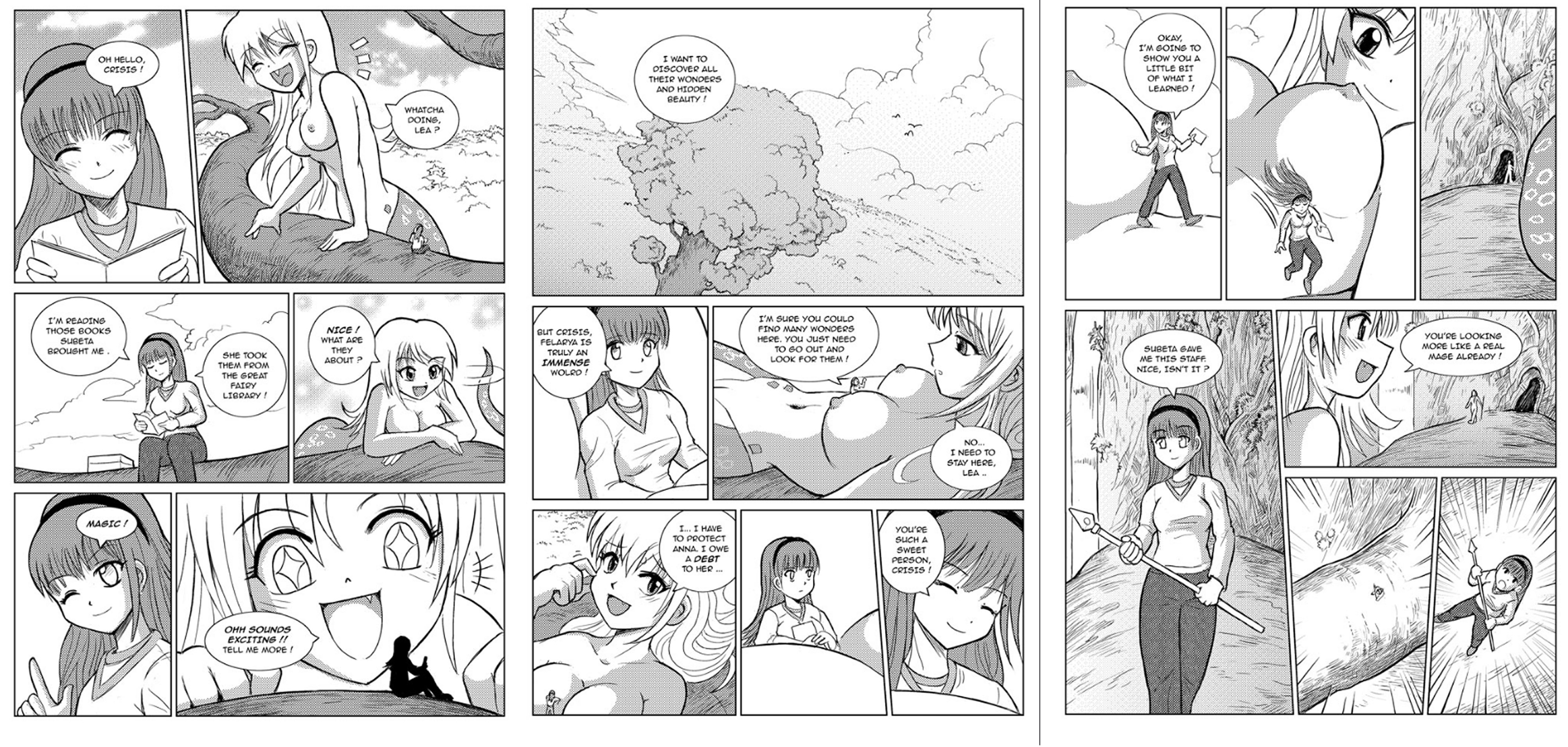One day, the Balfrezagg kingdom where Léa lived was attacked and almost razed to the ground by a more advanced army coming from another world. Léa survived the assault, only to be captured by the invaders and prepared for transport to their world, still as a slave. However, due to a dimensional disturbance they were forced to pass through Felarya, where they attracted the attention of a particular blond haired naga. Although Léa's new masters were nicer than her previous ones, they still treated their slaves pretty badly, so Léa didn't shed much tears for them when Crisis ambushed and devoured them. Locked in a cage, right in the middle of the convoy during Crisis'attack, Léa saw the naga eat her new masters one by one, quickly gulping them down. When she took Léa's cage and raised it to her mouth, Léa was calmly accepting her fate and spoke to Crisis, thanking her for freeing her at least, even if for a brief instant. Léa's beautiful voice intrigued Crisis and made the naga hesitate and instead of devouring the human she talked back. Impressed by Léa's calmness, and by her voice, Crisis asked her what her story was. Léa told it and, as the great story-teller she is, managed to captivate and move the naga. A true and solid friendship progressively developed between the two. Léa was free for the first time in her life, thank to Crisis, and Crisis had found in that strange human woman a wise friend who was always up for conversation and for telling stories. And Crisis adores stories!